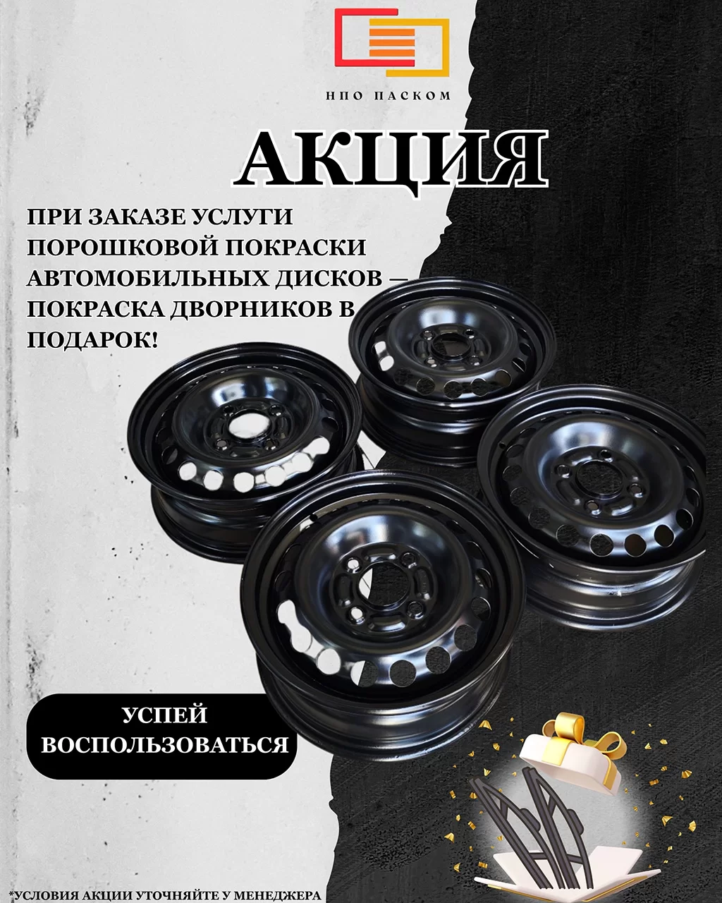 🔔Специальное предложение: при заказе услуги по порошковой покраске и пескоструйной обработке дисков Вы получаете в подарок покраску дворников!